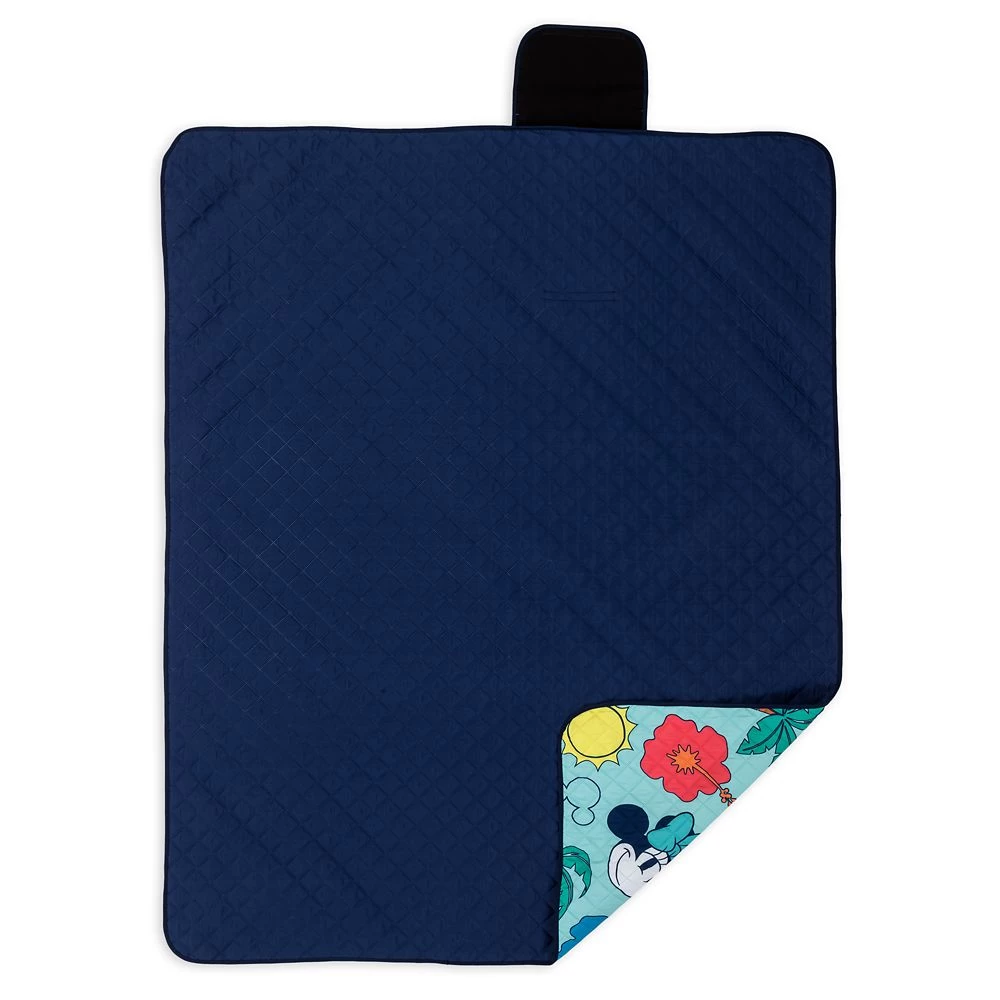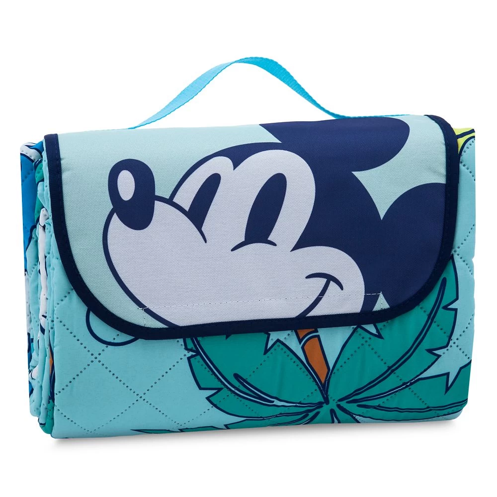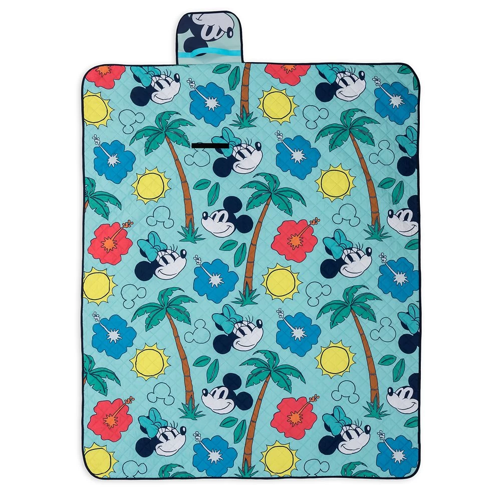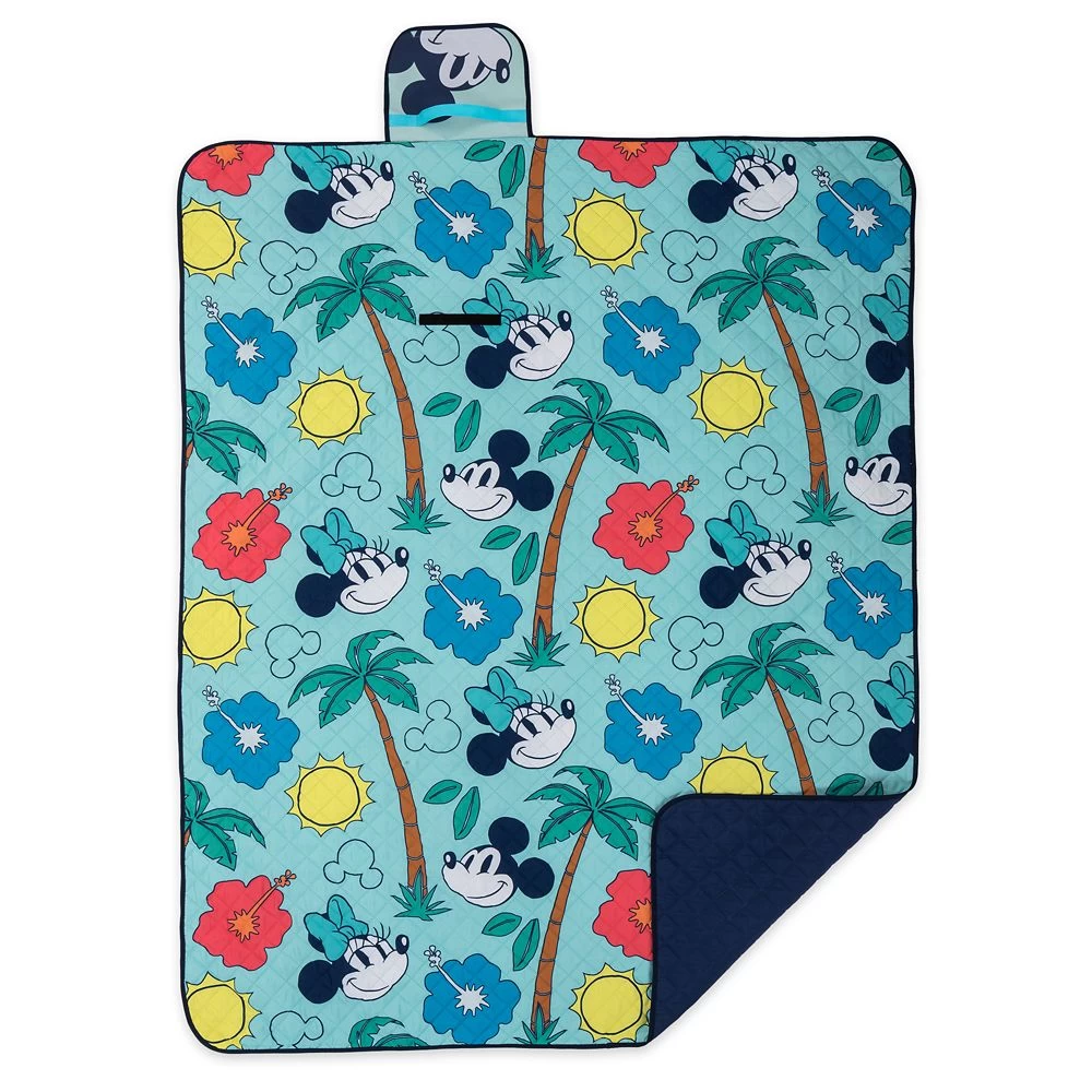 Picnics are always more fun when you have Mickey and Minnie for company. This quilted reversible picnic blanket features the couple in the summery allover print on one side with its palm trees, flowers, and bright yellow sun. The blanket folds up neatly and includes a flap with handle so it’s easy to carry to the beach or park.