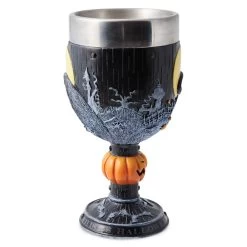 Raise your goblet to the Pumpkin King this Halloween with our Disney Showcase Collection Chalice featuring the iconic moonlit scene with Sally and Jack silhouetted atop Spiral Hill. Stainless steel insert makes for easy hand washing. Hand painted and decorated with faceted gems.