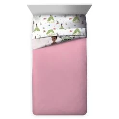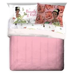 - Reversible comforter features Tiana on one side and all pink on the reverse side